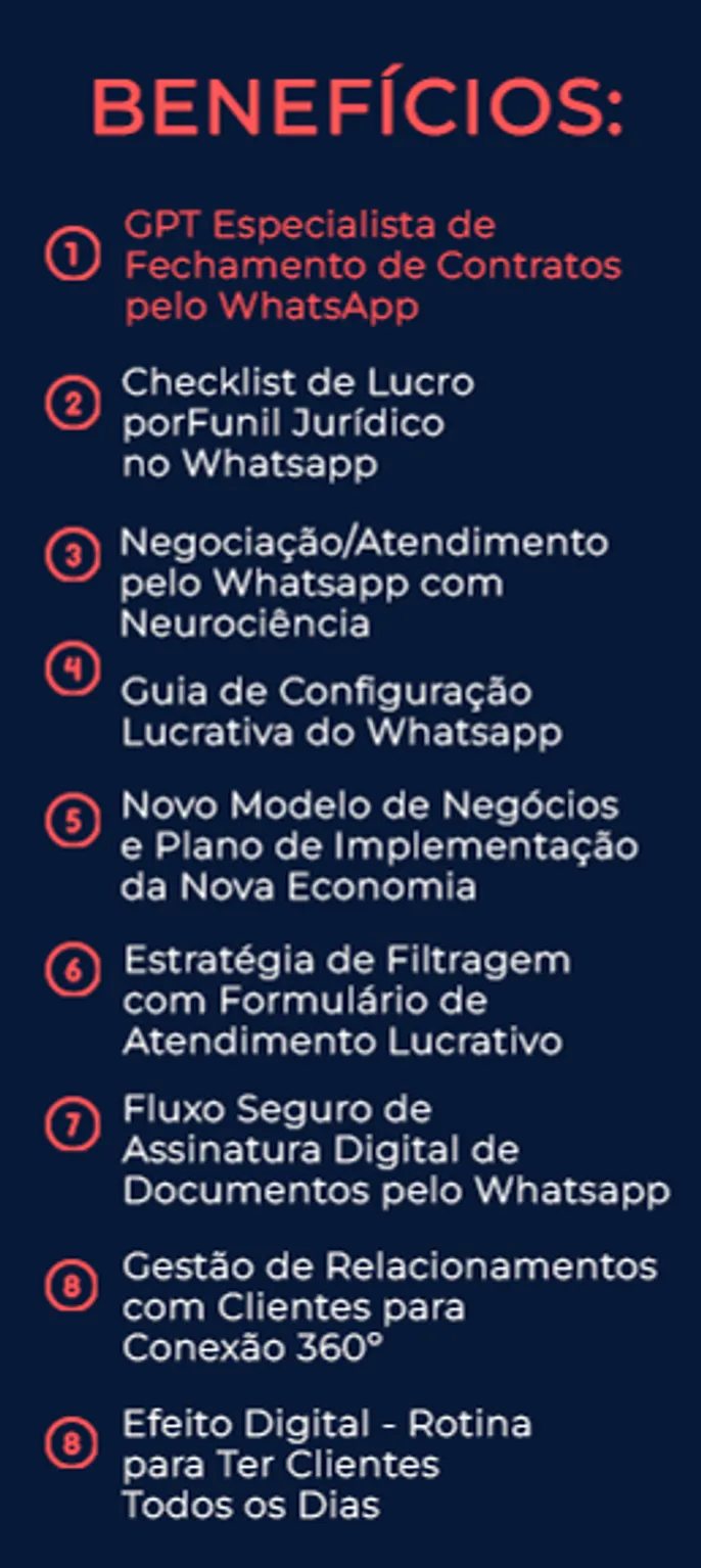 MESTRE DO WHATSAPP JURÍDICO LUCRATIVO C\ I.A.: 🥇método prático para filtragem, negociação e lucro dos melhores clientes pelo Whatsapp [Estratégia Moderna + Tráfego 360º + Página de Vendas AEC + Base de contatos organizada e ativa + Atendimento Comercial + Scripts de Venda] + 📘Manual do Lucro por Funil Jurídico + 📗116 Comandos de ChatGPT [estratégia + tráfego + Landing Page + Formulário + Atendimento Comercial] + ⚙️Configuração Profissional do Whatsapp + 🧠Negociação Avançada pelo Whatsapp + 🥇Prospecção de clientes no Jusbrasil e Jusfy com I.A. + ☑️As 20 melhores técnicas de fechamento de contratos + 🤖GPT Especialista em Vendas pelo Whatsapp + 🤖 GPT Especialista e Rotinas de Prospecção para Advogados + [ACESSO VITALÍCIO] + [ATUALIZAÇÕES]